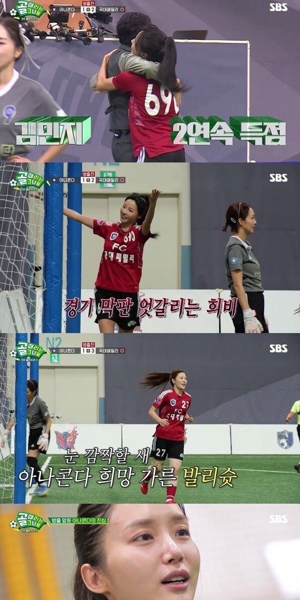 후반전은 초반부터 육탄전이 펼쳐지며 치열한 공방전이 이어졌다. ‘국대패밀리’는 계속해서 좋은 찬스를 만들어내며 몰아쳤지만 ‘아나콘다’는 혼신의 수비로 골문을 지켜냈다. 그러나 경기 막판 양팀의 희비가 엇갈렸다. ‘국대패밀리’ 김민지가 헤딩골을 만들어내며 승부를 뒤집은 것. ‘골때녀’ 최단 시간 선제골을 터뜨리며 좋은 흐름을 보여줬던 ‘아나콘다’ 선수들은 뒤집힌 리드에 아쉬움을 감추지 못했다.