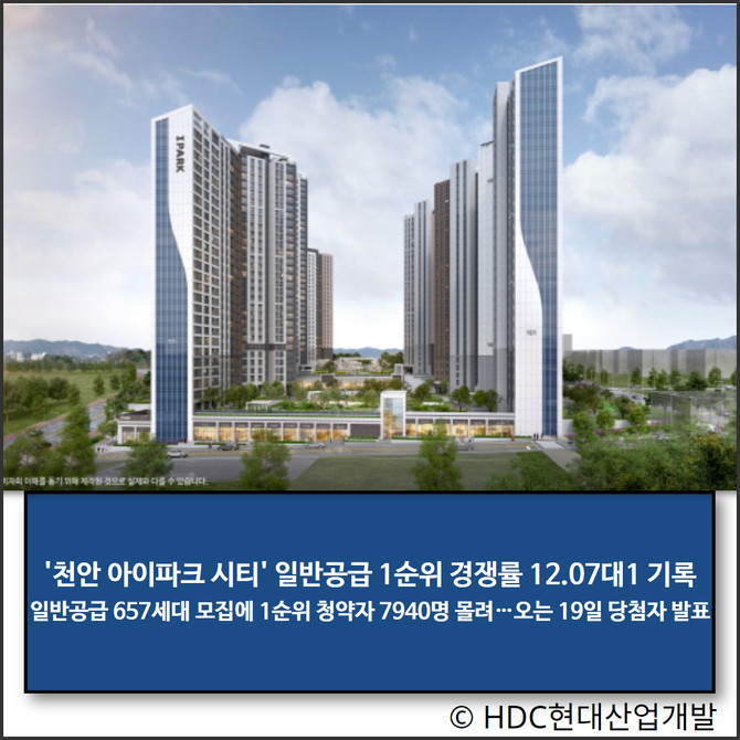 HDC현대산업개발(이하 HDC현산·294870)이 충남 천안시 서북구 성성5지구 일원에 건립하는 '천안 아이파크 시티' 일반공급 657세대 모집에 1순위 청약자 7940명이 몰리며 12.07대 1의 높은 경쟁률을 기록했다.