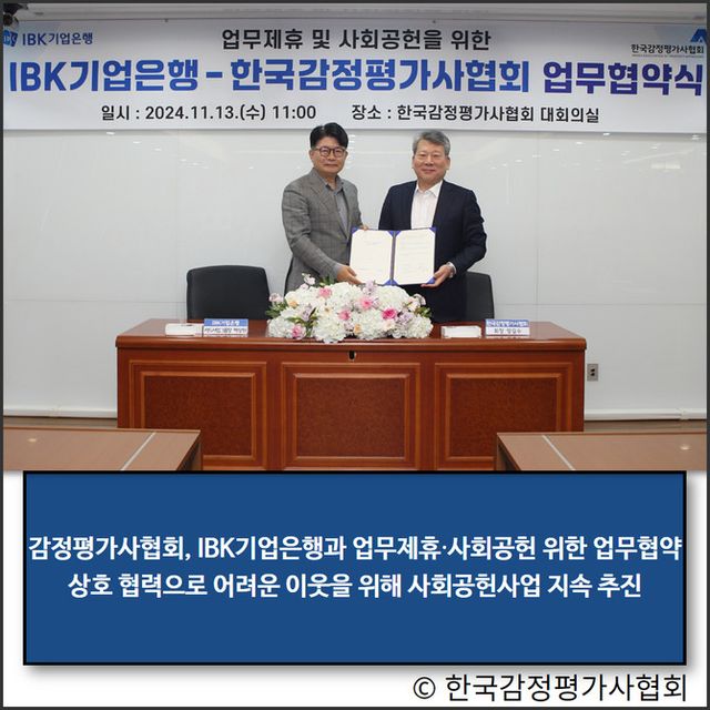 한국감정평가사협회가 IBK기업은행과 함께 어려운 이웃을 위한 사회공헌사업에 함께 한다.