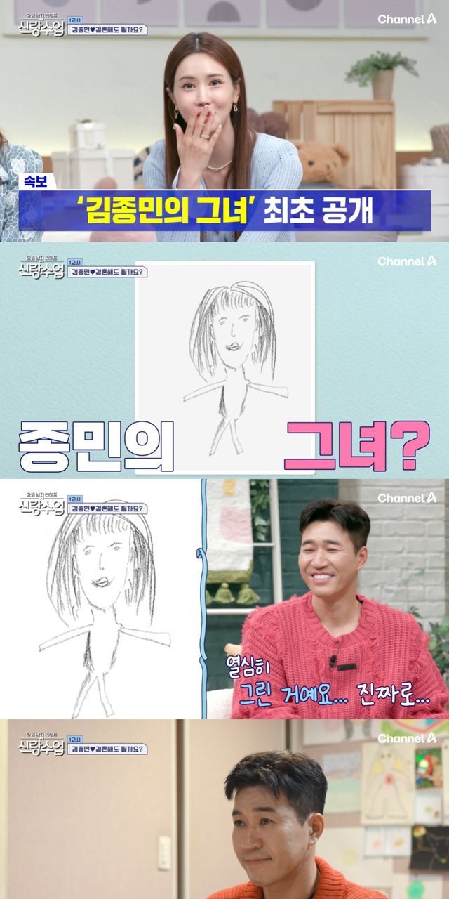 문세윤 등 스튜디오는 "여자친구 최초 공개냐"며 기대를 표했지만 표정만 진지했던 처참한(?) 김종민의 그림 실력에 웃음을 터트렸다.