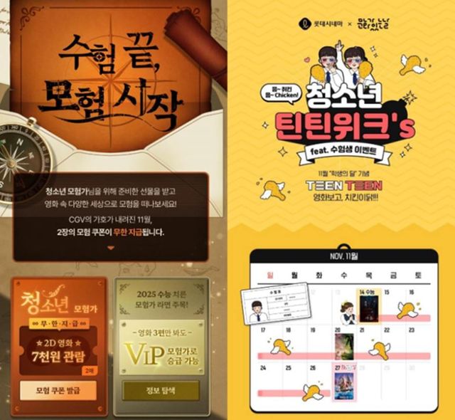 롯데시네마는 수험생과 청소년들을 위한 '틴틴위크's' 이벤트를 마련했다. 26일까지 수험생 및 만 13~18세 청소년은 7000원에 영화를 관람할 수 있으며, 미니언즈 키링 콤보도 6000원 할인된 가격에 제공된다. 쿠폰은 롯데시네마 홈페이지에서 선착순 3만 명에게 배포된다. 이외에도 청소년 전용 멤버십 '틴틴클럽' 회원을 대상으로 교촌 오리지널 치킨을 선물하는 등 다양한 혜택을 준비했다.