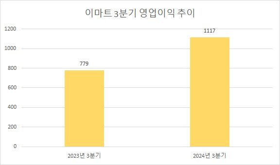 이마트는 올 3분기 연결기준 영업이익 1117억원으로 전년 동기대비 43.4% 증가한 실적을 올렸다고 14일 밝혔다.