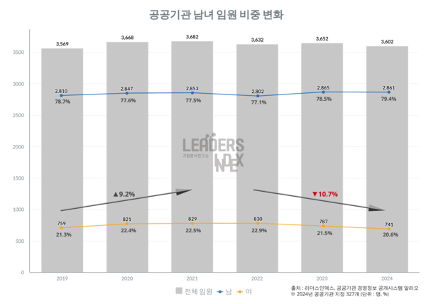 조사 대상 기관의 여성 직원 증가율도 둔화했다. 여성 직원은 2019∼2021년 13만714명에서 14만5239명으로 11.1% 늘었는데, 2022∼2024년에는 15만432명에서 15만2362명으로 1.3% 증가했다.