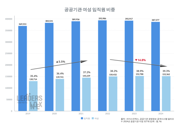 14일 기업분석연구소 리더스인덱스에 따르면 공공기관 경영정보 공개시스템 알리오(ALIO)에 공개된 327개 공공기관을 조사·분석한 결과 2022~2024년 여성임원 수가 10.7% 감소했다.