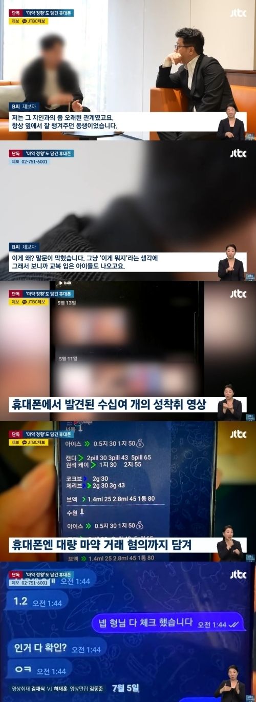 지인 B 씨가 휴대전화에서 발견한 미성년자 의심 성착취물 및 마약 거래 정황. / 'JTBC News' 유튜브 영상 캡쳐