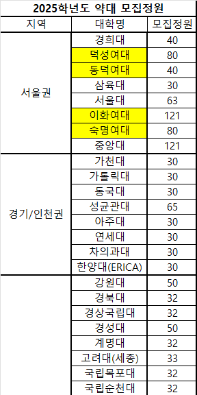 약대 정원 서울권 575명중 여대할당 321명으로 비율 56퍼센트