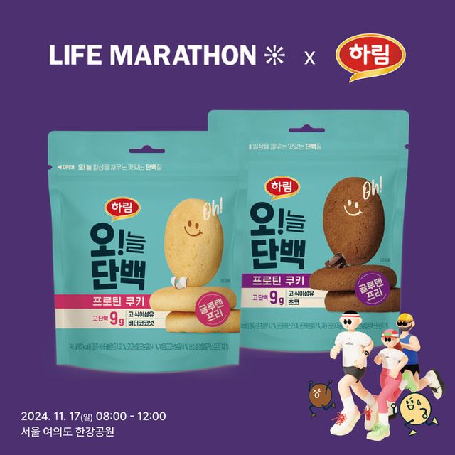 하림(136480)이 오는 17일 서울 여의도 한강공원에서 열리는 '서울라이프마라톤' 참가자들에게 밀가루 제로 '오!늘단백 프로틴 쿠키'를 후원한다.