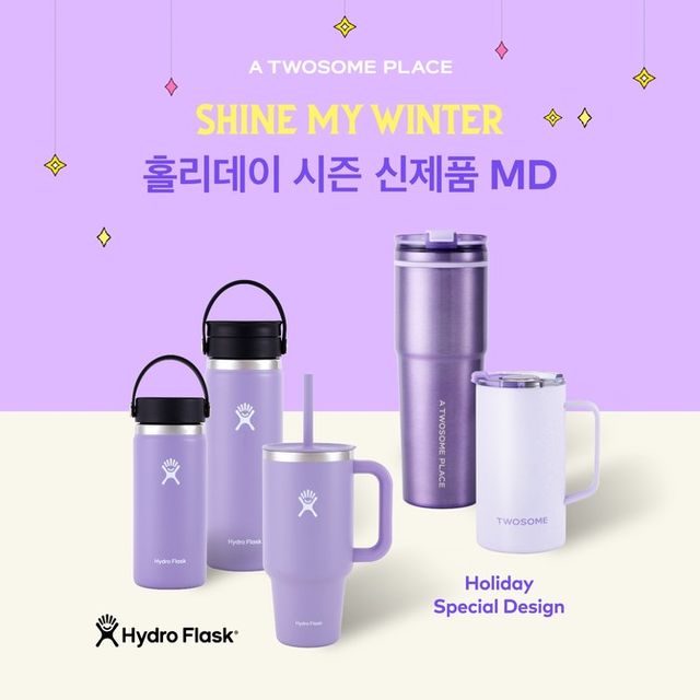 또한 자체 디자인한 '투썸 윈터 텀블러'도 함께 선보인다. 홀리데이를 빛내 줄 트렌디한 디자인에 기능성과 편의성을 두루 갖춘 제품으로, '투썸 윈터 MAX 텀블러(700㎖), '투썸 윈터 핸들 텀블러(591㎖)' 등 2가지로 구성됐다. '투썸 윈터 MAX 텀블러'는 은은한 광택의 보랏빛 색감이 돋보이며, '투썸 윈터 핸들 텀블러'는 눈 결정을 닮은 유니크한 질감이 특징이다.