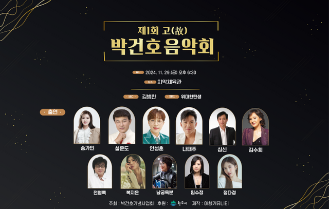 오는 29일 원주시 치악체육관에서 열리는 ‘제1회 박건호 음악회’는 송가인을 비롯하여 설운도, 전영록, 안성훈, 김수희, 심신, 남궁옥분, 임수정, 나태주, 정다경, 복지은 등 국내 최고의 가수들이 한자리에 모이는 만큼 다채로운 볼거리와 감동을 선사할 예정이다.