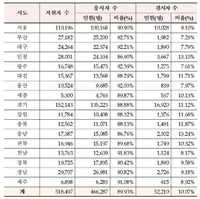시도별 결시율을 살펴보면 충남이 13.24%로 가장 높았다. 이어 인천 13.10%, 충북 11.87%, 대전 11.71%, 강원 11.68%, 경기 11.12%, 전북 10.32%, 세종 10.13%, 경북 9.58%, 경남 9.18%, 서울 9.10%, 제주 8.92%, 전남 8.17%, 울산 7.97%, 대구 7.79%, 광주 7.61% 순이다. 부산은 7.29%로 가장 낮은 결시율을 보였다.