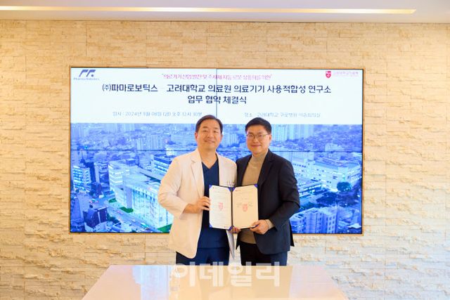 주사제 자동조제로봇 사용화 및 의료기기 산업 발전을 위해 진행된 이번 MOU는 고려대의료원 의료기기사용적합성연구소 박일호 소장, 손형국 연구교수, 파마라로보틱스 유제청 대표이사, 진경원 본부장, 유현우 팀장 등 관계자들이 참석했다.