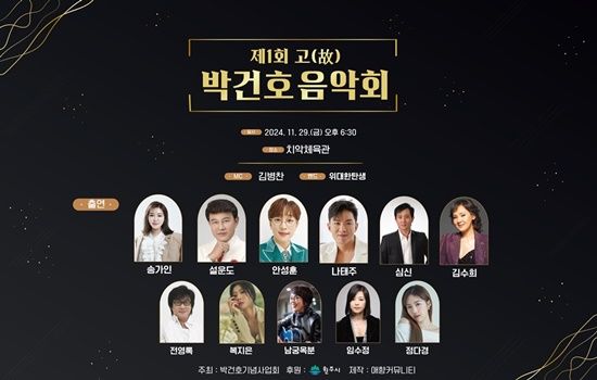 29일 원주시 치악체육관에서 열리는 ‘제1회 고(故) 박건호 음악회’에는 송가인을 비롯해 설운도, 전영록, 안성훈, 김수희, 심신, 남궁옥분, 임수정, 나태주, 정다경, 복지은 등 국내 최고의 가수들이 한자리에 모이는 만큼, 다채로운 볼거리와 감동을 선사할 예정이다.