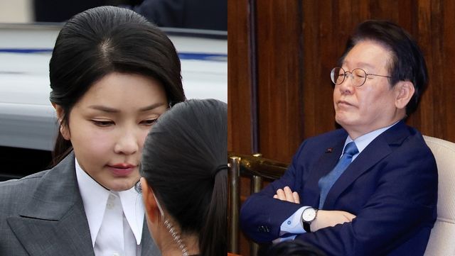 윤석열 대통령 아내 김건희 여사, 14일 김건희 특검법 반대 토론을 듣고 있는 이재명 더불어민주당 대표 / 뉴스1
