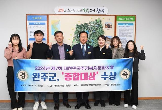 14일 완주군은 주거복지문화운동본부가 주최하고 행정안전부가 후원해 열린 제7회 주거복지문화대상 시상식에서 주거복지 분야 발전에 공헌한 성과를 인정받아 1위인 종합대상을 수상했다고 밝혔다.