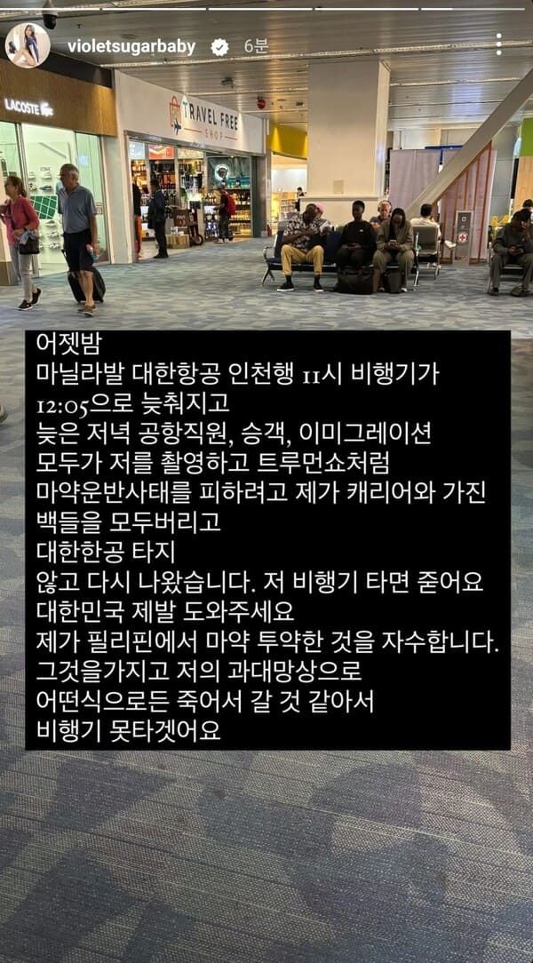 그러면서 "저 비행기 타면 죽어요ㅠㅠ 대한민국 제발 도와주세요. 제가 필리핀에서 마약 투약한 것을 자수합니다. 그것을 가지고 저의 과대망상으로 어떤 식으로든 죽어서 갈 것 같아서 비행기를 못 타겠어요", "비행기 타면 저 죽을 것 같아요. 마닐라에서도 나가면 죽을 것 같아요. 공항도 위험하고, 마닐라 공항인데 제발 도와주세요"라고 했다. 그리고 얼마 지나지 않아 해당 글은 삭제됐다.