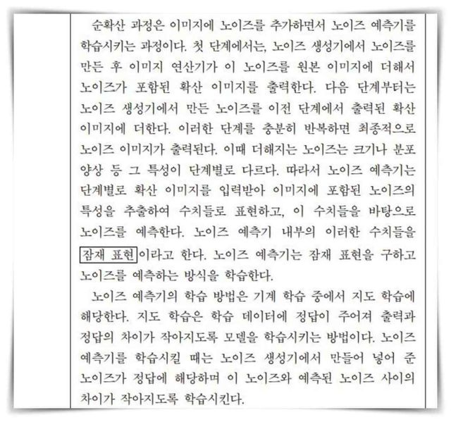 일례로 이 지문에는 "노이즈 예측기를 학습시킬 때는 노이즈 생성기에서 만들어 넣어 준 노이즈가 정답에 해당하며 이 노이즈와 예측된 노이즈 사이의 차이가 작아지도록 학습시킨다"는 내용이 나왔는데, 이 문장에서만 '노이즈'가 5번이나 나왔다.