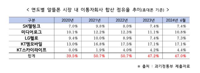 종합대책에는 이통3사 자회사 중심의 알뜰폰 시장 구조 변화를 위해 현행보다 강력한 합산 점유율 규제 도입이 예상된다. 현재 이통3사 자회사의 알뜰폰 시장 합산 점유율은 50%로 제한돼 있는데, 휴대폰 뿐 아니라 가입자기반 단말장치, 사물인터넷(IoT)을 포함한 ‘전체 회선’을 기준으로 삼고 있다. 규제를 강화할 경우 기준을 휴대폰 만으로 좁혀 합산 점유율을 제한하는 방안이 포함될 것으로 예상된다.
