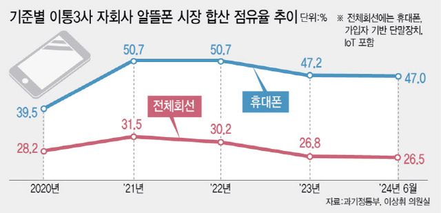 전체 회선을 기준으로 할 때 올 6월 기준 이통3사 자회사의 알뜰폰 시장 합산 점유율은 26.5%에 불과하지만, 휴대폰 만을 기준으로 하면 점유율 제한 기준에 가까운 47%까지 껑충 뛴다. 과기정통부는 작년부터 점유율 산출 시 IoT 회선을 제외하는 안을 놓고 통신업계와 소통해 왔고, 업계도 수용하는 분위기로 알려졌다.