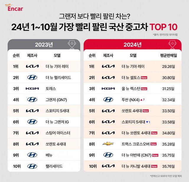 주목할 점은 상위 10개 모델에 최근 신차 시장에서도 인기가 높은 기아의 SUV, RV 모델들이 주로 포진했다는 점이다. 1위 레이에 이어 2위는 더 뉴 셀토스(30.80일), 5위 쏘렌토 4세대(33.50일), 6위 스포티지 5세대(33.58일), 7위 더 뉴 쏘렌토 4세대(34.80일)였다. 마지막 10위는 더 뉴 카니발 4세대(35.76일)가 올랐다. 이 중 셀토스와 신형 모델인 더 뉴 쏘렌토 4세대, 더 뉴 카니발 4세대는 올해 순위권에 새롭게 진입했다.