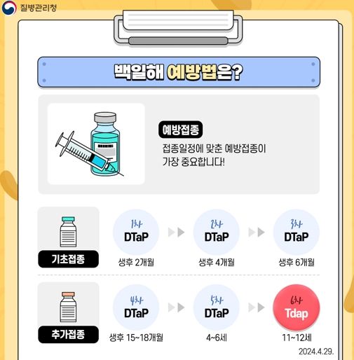 영유아는 기초 3회(2·4·6개월), 추가 3회(15~18개월, 4~6세, 11~12세) 총 6회 적기 예방접종을 하는 것이 중요하며, 임신부의 경우 생후 첫 접종(2개월) 이전 영아가 백일해에 대한 면역력을 갖고 태어날 수 있도록 임신 3기(27~36주)에 예방접종을 해야 한다.