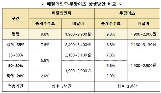 쿠팡이츠는 거래액 기준 △상위 35%에 대해서는 중개수수료 8.8%에 배달비 2,130~3,130원 △중위 35~50%에 대해서는 중개수수료 7.8%에 배달비 1,900~2,900원 △중위 50~80%에 대해서는 중개수수료 6.8%에 배달비 1,900~2,900원 △하위 20%에 대해서는 중개수수료 2.0%에 배달비 1,900~2,900원을 부과하는 방안을 제시했다.