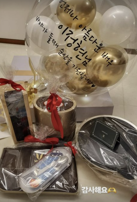 공개된 사진에는 순산 기원 메시지가 적힌 풍선과 함께 출산과 육아에 필요한 용품 선물들의 모습이 담겨있다.