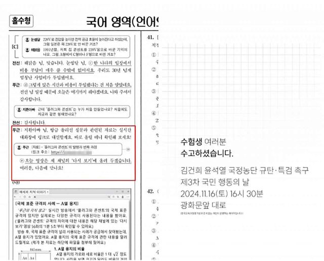 14일 치러진 수능 국어 영역 선택과목 ‘언어와 매체’ 40~43번 지문에 적힌 링크를 입력하면 원래의 출제 의도와는 달리 ‘윤석열 대통령 퇴진 집회’를 알리는 사이트로 연결됐다.