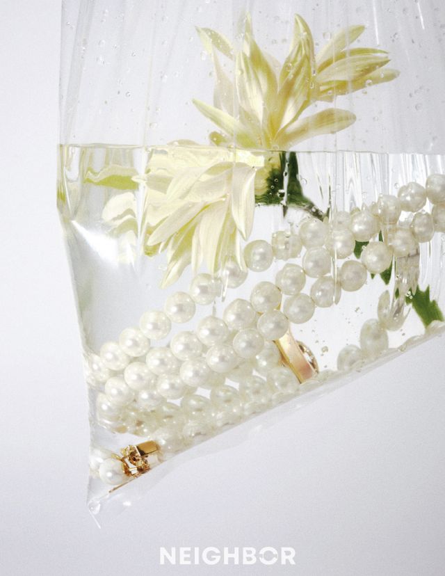 Celine by Hedi Slimane 레진 진주 소재 미니 이어링, 레진 진주를 세 줄에 걸쳐 빼곡히 장식한 진주 네크리스 모두 가격 미정.