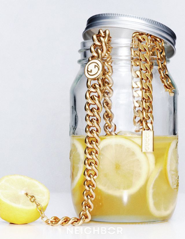 Gucci 도금 메탈 소재의 청키한 체인 네크리스와 메탈 브레이슬릿 모두 가격 미정.