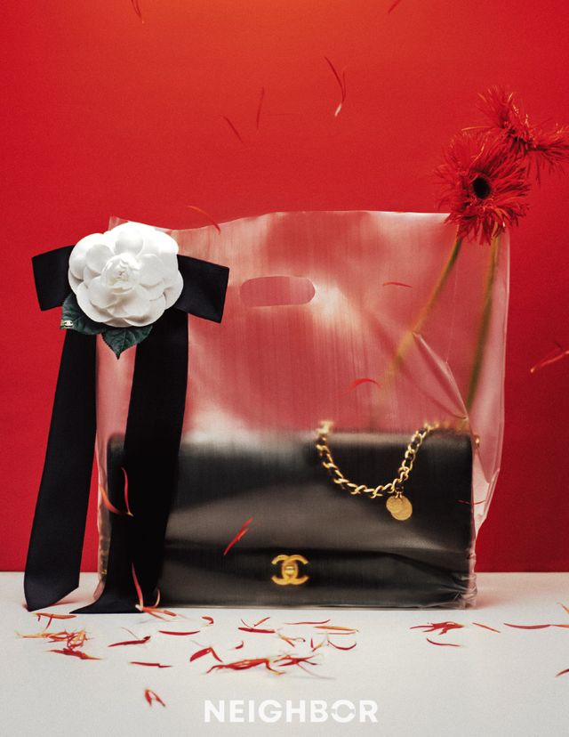 Chanel 상징적인 까멜리아 모티프를 장식한 리본 헤어클립, 체인 장식의 카프스킨 소재 클러치 모두 가격 미정.
