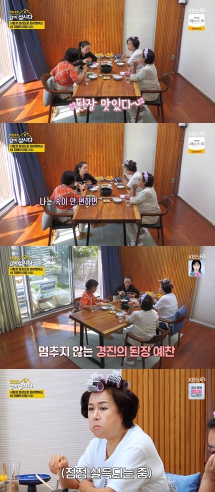 과거 유방암 투병했던 경진은 "나는 속이 안 편하면 밥에다 된장찌개만 말아먹으면 속이 편안해. 내가 아팠을 때는 이게 약 같더라. 이것만 먹으며 기운이 나"라며, 된장찌개를 예찬했다.
