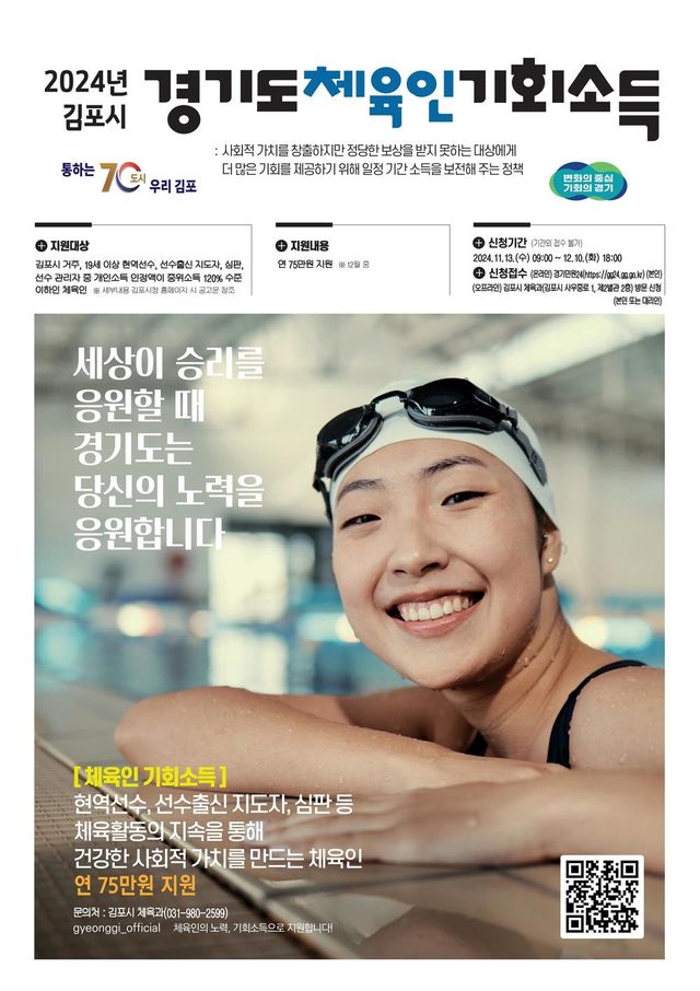 김포시(시장 김병수)는 체육인 기회소득 신청을 2024년 11월 13일부터 2024년 12월 10일까지 접수한다고 밝혔다.