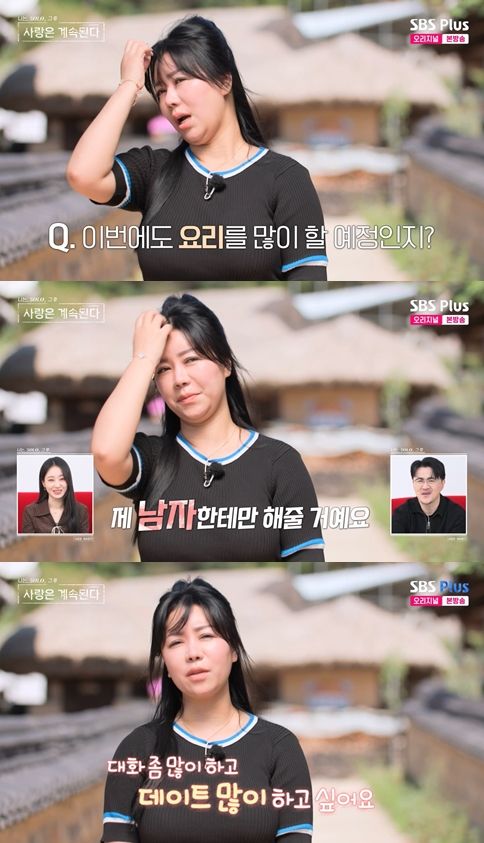 다음으로 등장한 10기 정숙은 "이번에도 요리를 많이 할 예정이냐"라는 제작진의 질문에, "아니요, 안 할거예요. 제 남자한테만 해줄 거예요"라고 못박았다.