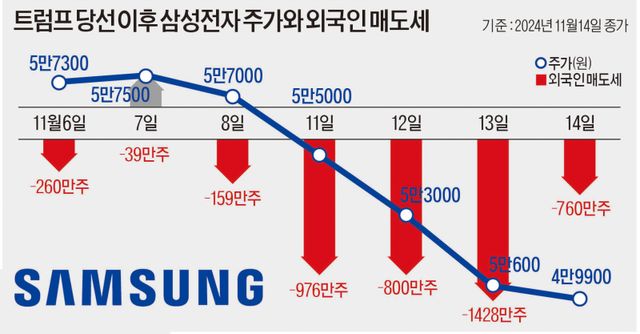 삼성전자 주가는 최근 도널드 트럼프 전 미국 대통령의 당선 소식에 크게 요동치고 있다. 외국인 투자자는 삼성전자 주식을 집중적으로 매도하며 주가를 끌어내리고 있다. 트럼프 당선 소식 이후 삼성전자 주가는 15% 가량 하락하고 있다.