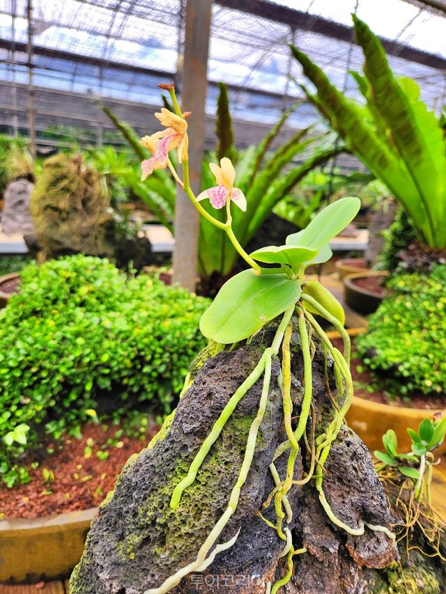 제주는 화산활동으로 탄생, 90%가 현무암으로 돼 있는 척박한 땅이었다. 그럼에도 불구, 돌의 트멍(구멍)마다 물기가 고이며 끈질기게 생명을 틔워냈다. 이런 강인한 생명력을 ‘석부작 전시관’에서 엿볼 수 있다.