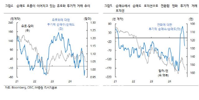 이러한 분위기를 반영하듯 유로에 대한 투기적 순매도 포지션 규모가 확대되는 동시에 엔화에 대한 투기적 포지션은 순매수에서 순매도 전환됐다. 즉, 유로 및 엔화에 대한 추가적 약세 기대감이 확산되고 있는 시그널이다.