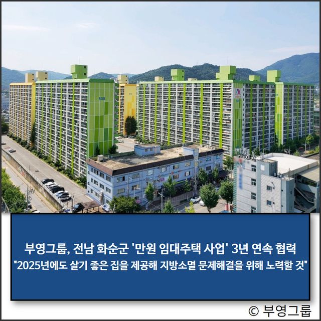 부영그룹이 3년 연속 전남 화순군의 '만원 임대주택 공급 사업'에 참여한다.