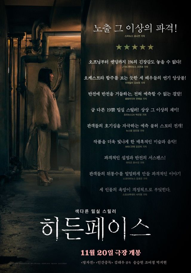 개봉 전부터 언론의 극찬 세례를 받으며 기대작으로 떠오른 색(色)다른 밀실 스릴러 ‘히든페이스’는 11월 20일(수) 극장에서 개봉한다.