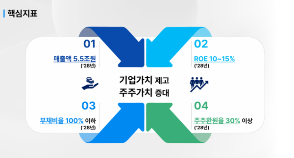 롯데칠성은 매출 5조5000억원(2028년) 달성을 목표도 세웠다. 경쟁사 대비 높은 부채비율을 100% 이하로 낮추고, ROE를 10~15% 수준으로 유지해 기업가치를 끌어올리겠다는 계획이다.