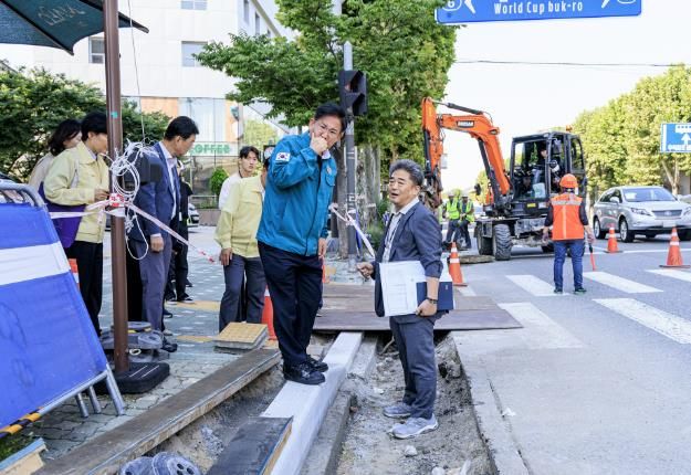 | ▲ 박강수 마포구청장이 개선 공사가 진행 중인 횡단보도와 주변 도로를 살피고 있다. |