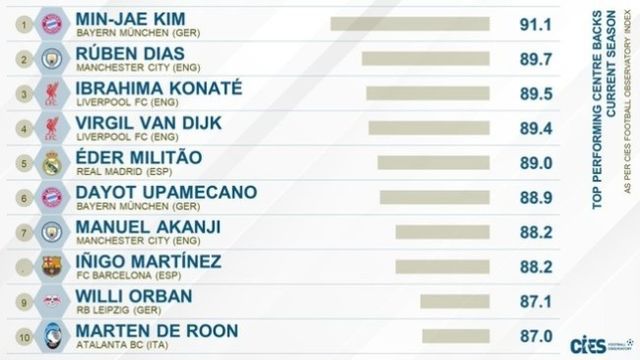 1위는 김민재였다. 김민재는 91.1점을 받았다. 후벵 디아스(89.7점), 이브라히마 코나테(89.5점), 버질 판다이크(89.4점), 에데르 밀리탕(89점), 다요 우파메카노(88.9점), 마누엘 아칸지(88.2점). 윌리 오르반(87.1점), 마르틴 더룬(87점)이 뒤를 이었다.