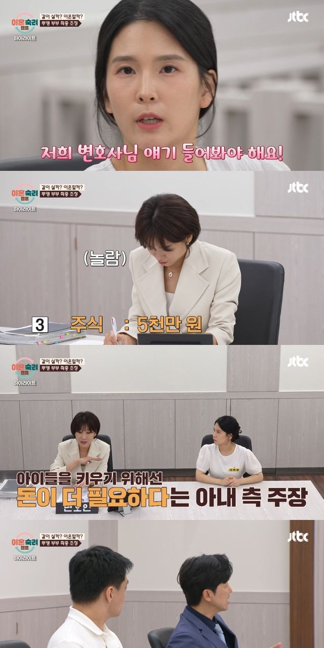 이에 아내는 "같이 이야기고 저도 찾아볼 거다"라고 발끈했고 남편의 변호사는 "실제로 해결할 수 있어야 한다"고 단호히 말했다.