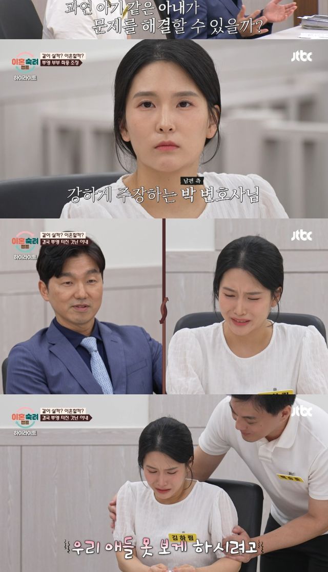 아내 측 변호사는 "아내가 발전할 의지가 있다"고 감쌌지만, 아내는 "제가 양육권 가질 거다"라며 조정 중에도 '뿌엥' 눈물을 터트렸다.