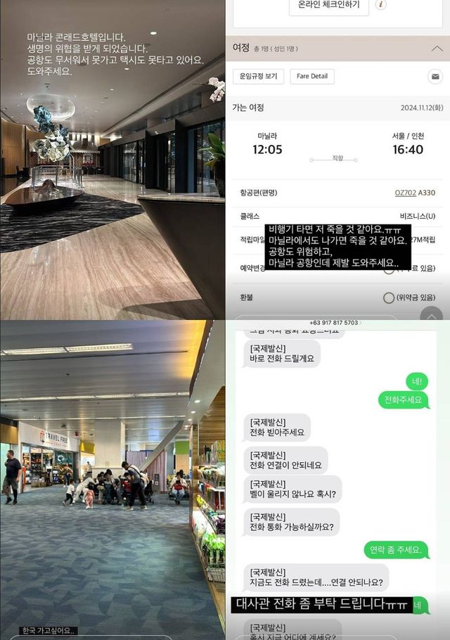 그는 "마닐라 콘래드 호텔입니다. 생명의 위협을 받게 되었습니다. 공항도 무서워서 못가고 택시도 못타고 있어요. 도와주세요"라며 긴급한 상황임을 알렸고, "대사관 전화 좀 부탁드립니다"라며 문자 캡처 사진을 공개했다.