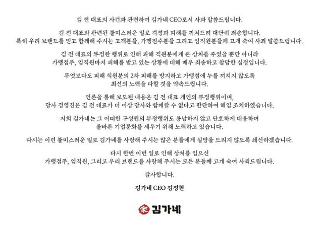 김정현 대표이사는 15일 "언론을 통해 보도된 내용은 (부친) 김 전 대표 개인의 부정행위이다. 당사 경영진은 김 전 대표가 더 이상 당사와 함께할 수 없다고 판단해 해임 조치했다"고 김가네 홈페이지에 공지문을 띄웠다.