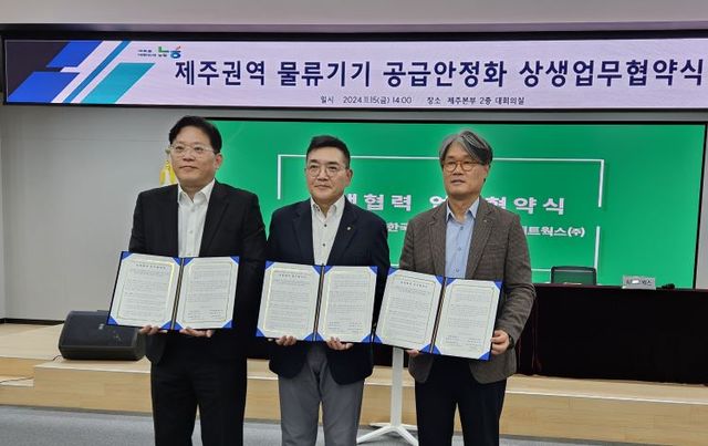 농협경제지주와 한국파렛트풀(주), AJ네트워크(주)는 15일 농협제주본부에서 제주권역 물류기기 공급 안정화를 위한 상생협력을 체결했다. 문미숙기자