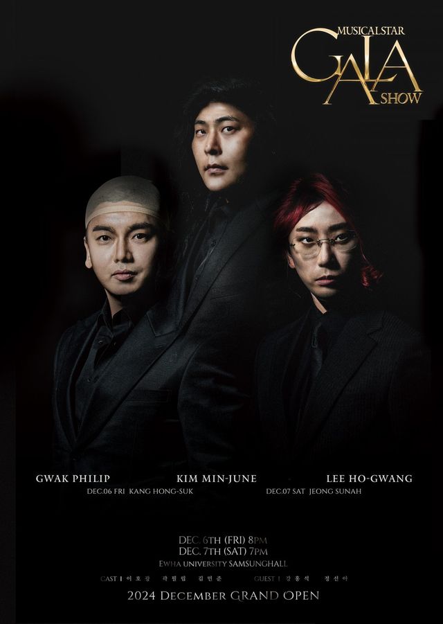뮤지컬 공연 ‘뮤지컬스타 갈라쇼’의 분위기를 엿볼 수 있는 2차 포스터가 소속사 메타코미디 공식 SNS를 통해 공개된 바. 지난 메인 포스터에서는 ‘뮤지컬스타’의 한 장면을 연상시키는 시그니처 분장과 포즈를 한 곽범(곽필립), 이창호(이호광), 김해준(김민준)의 변신이 화제를 모은 데 이어 이번 2차 포스터에서는 카리스마 넘치는 표정으로 정면을 응시하고 있어 강렬한 무대를 예고하고 있다.