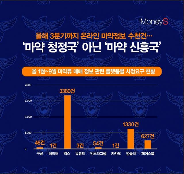 1~9월 마약류 매매 정보 관련 플랫폼별 시정요구 현황을 보면 네이버와 카카오 각 1건, 구글 46건, 유튜브 3건, 엑스(옛 트위터) 3380건, 페이스북 627건, 인스타그램 54건, 텀블러 1330건으로 집계됐다.