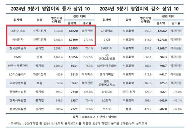 두 반도체 양강 기업 덕분에 IT전기전자 업종의 영업이익은 전년 동기 대비 520% 이상 급증했지만 석유화학 업종은 적자 전환했다.
