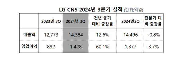 14일 LG CNS가 공시한 바에 따르면 이 회사의 3분기 연결기준 영업이익은 1428억원으로 전년 동기 대비 60.1% 증가했다. 전 분기와 비교해서도 3.7% 신장세를 보였다.